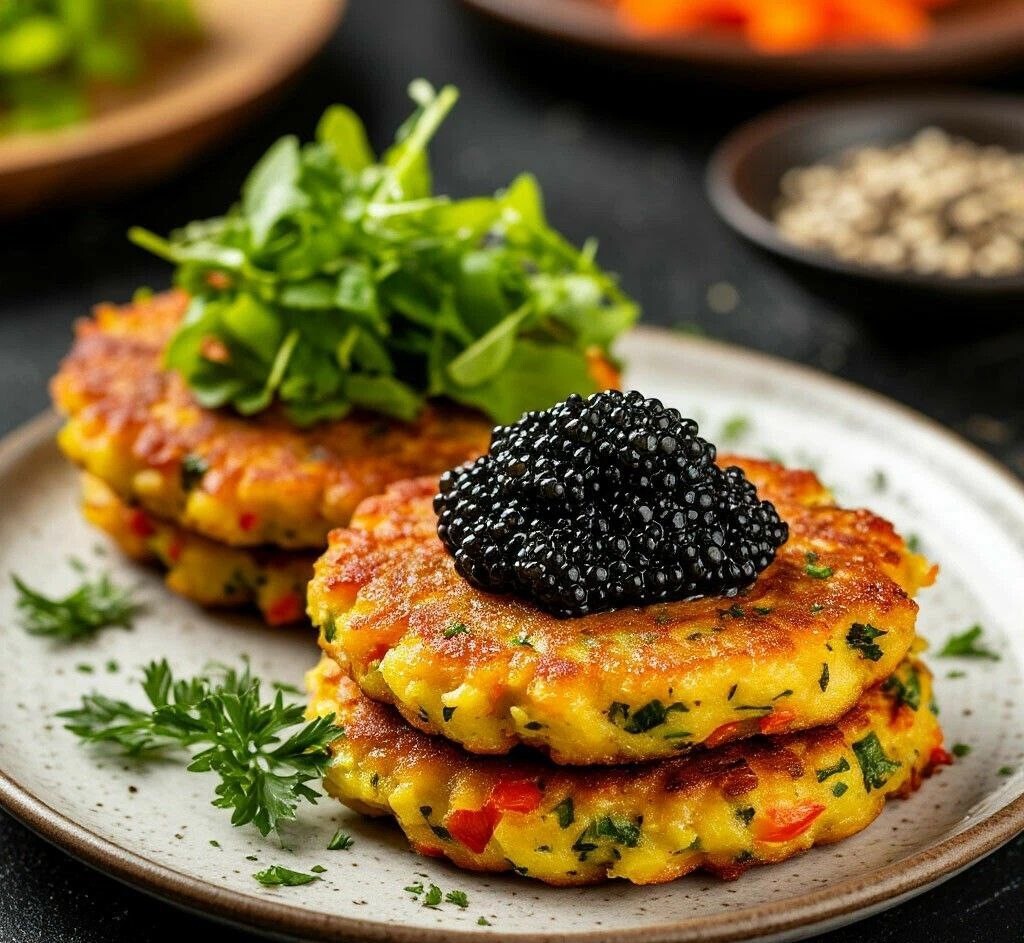 Овощные оладьи — легкое и универсальное блюдо. В сочетании с черной икрой обычные оладьи превращаются в эффектную закуску, где нейтральная основа подчеркивает деликатность и вкус икры. Их можно подавать теплыми или охлажденными — на фуршет, легкий ужин или праздничный стол.